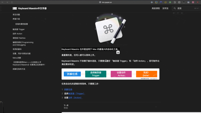 Keyboard Maestro 不依赖于脚本语言，只需要设置好 「触发器 Trigger」 和 「动作 Action」 ，即可制作出满足需求的宏。