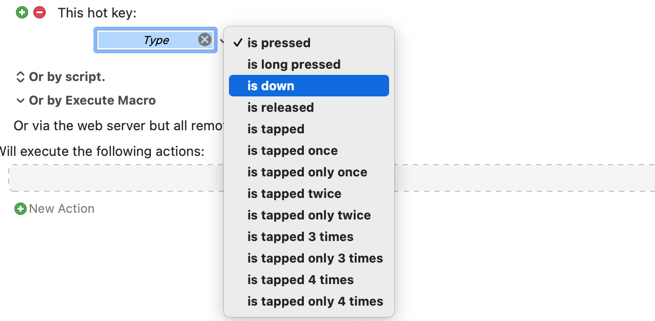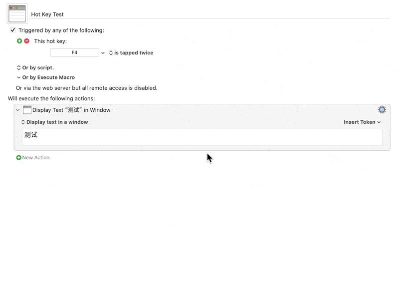 ⚠️ 请记住,无论您是否在按下、按下、释放或点击快捷键时触发宏,该键都会被系统吞没,无法用于其正常用途。如果您想在不被系统吞掉按键的情况下触发宏,可以使用 USB_Device_Key 触发器。