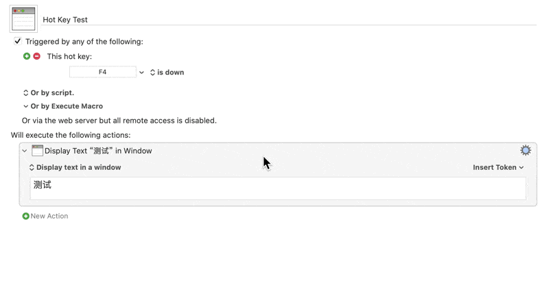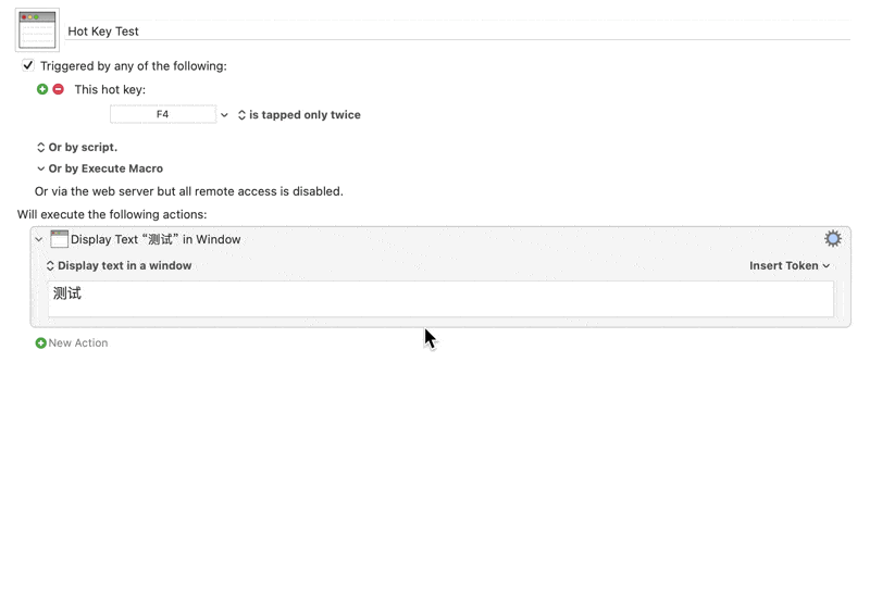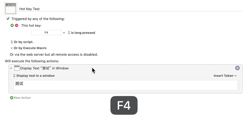 由上图可以看出,在长按F4的情况下,按的时间超出了一定时间,不会触发动作;只有在短时间内轻敲按键(快速按下并释放),才会在完成动作时(也就是松开按键时)触发动作。