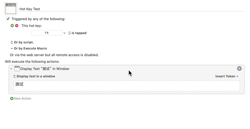 ⚠️ 请注意,Keyboard Maestro 本身键入的按键是否会触发快捷键(从而被吞掉并执行宏)或不会触发快捷键(从而进入应用程序)尚未定义 - 可能会发生哪种行为以及哪种行为发生的情况会因许多不可预测的因素而有所不同,但键盘大师会尽力确保不会因响应自己的输入而触发宏。如果您希望根据击键触发宏,可以使用“通过快捷键触发宏”操作。