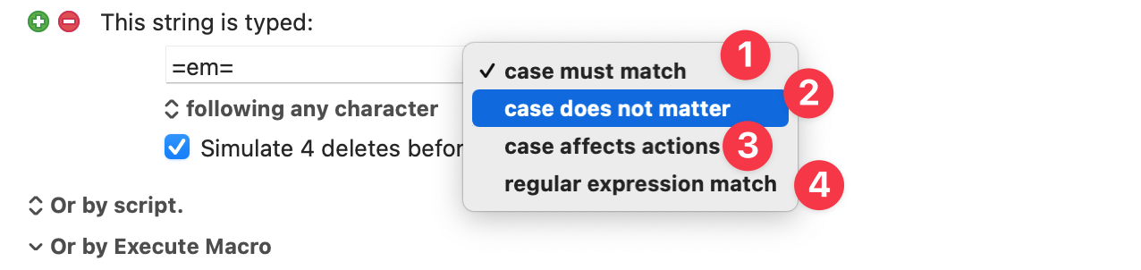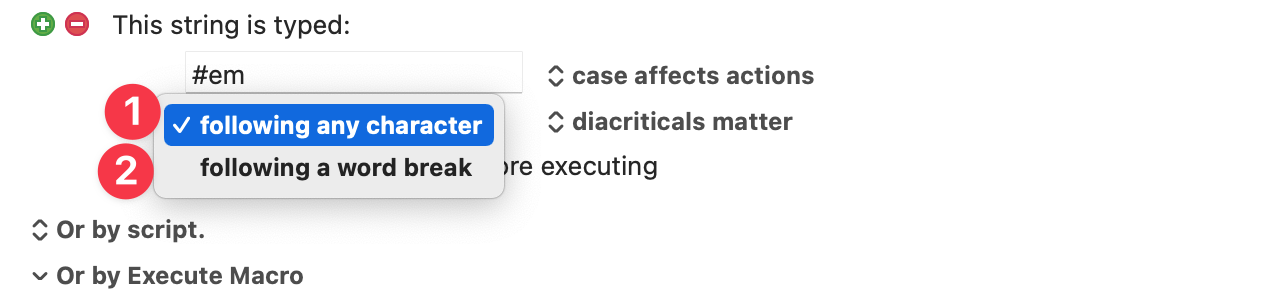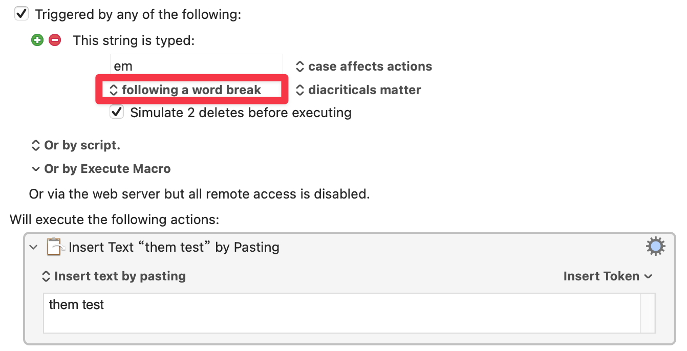 您可以将键入的字符串触发器限制为仅在断字后起作用(这意味着任何非字母数字字符,或取消上述序列的任何情况)。请注意,这意味着仅在您键入分词符、然后键入的字符串后才会发生匹配, - Keyboard Maestro 无法预知你未来会键入什么,所以它不能仅在你计划接下来键入一个词边界时才匹配字符串。这意味着,触发条件的检测只能在你实际完成键入动作之后进行,而不是基于你未来的键入计划。