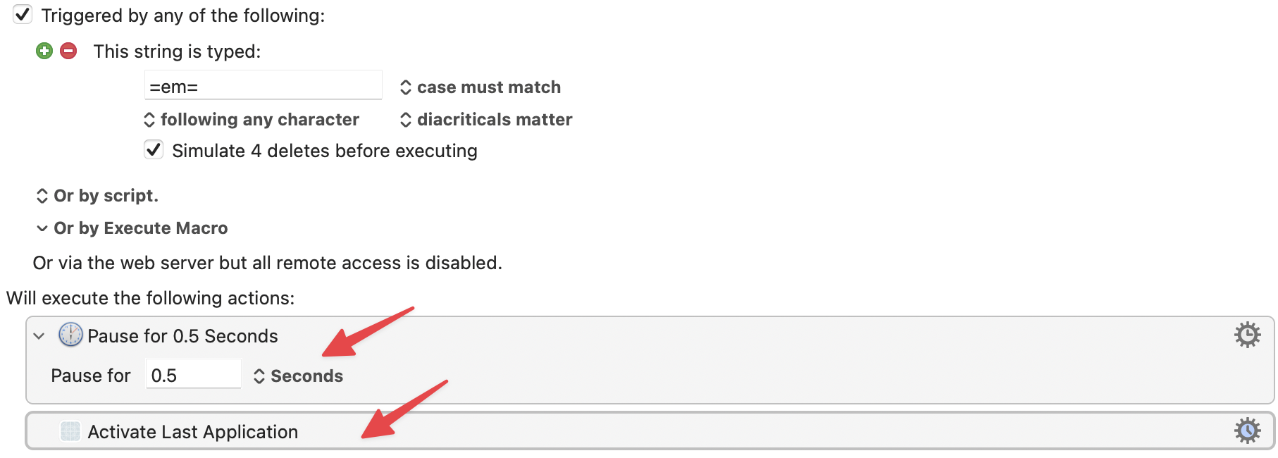 输入字符串触发器允许您使用更详细(因此更具描述性)的按键序列来触发宏。触发器可以包含非 ASCII 字符,但您应该验证删除在这些情况下是否正常工作。触发器可以包含修饰符 (⌃⌥⇧⌘) 字符 (v11.0+),您可以通过点击相应的修饰符来输入这些字符。